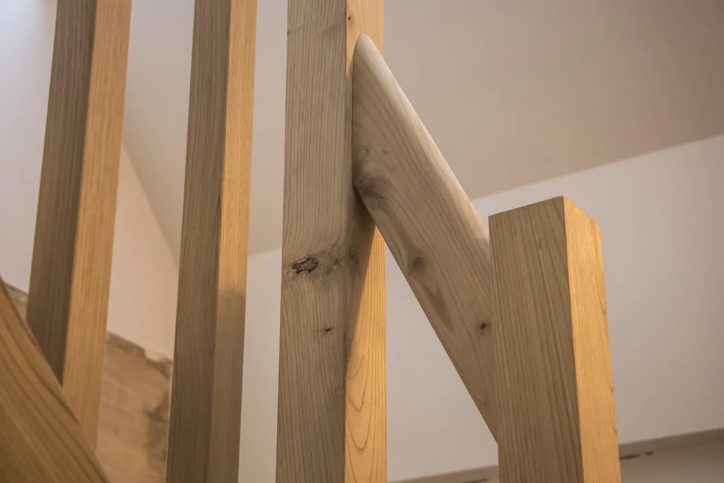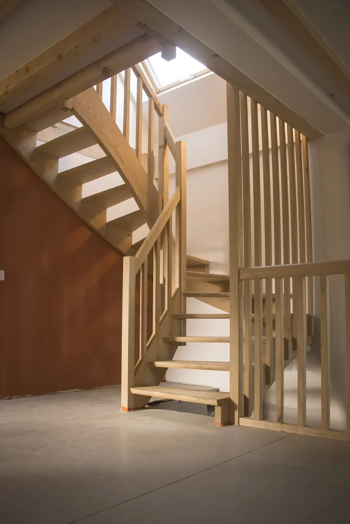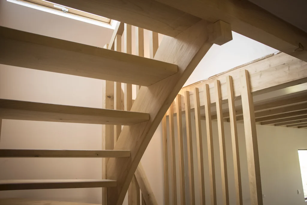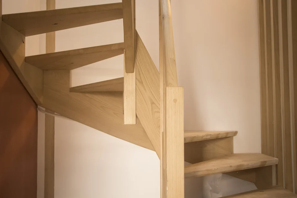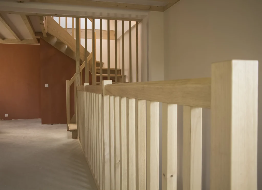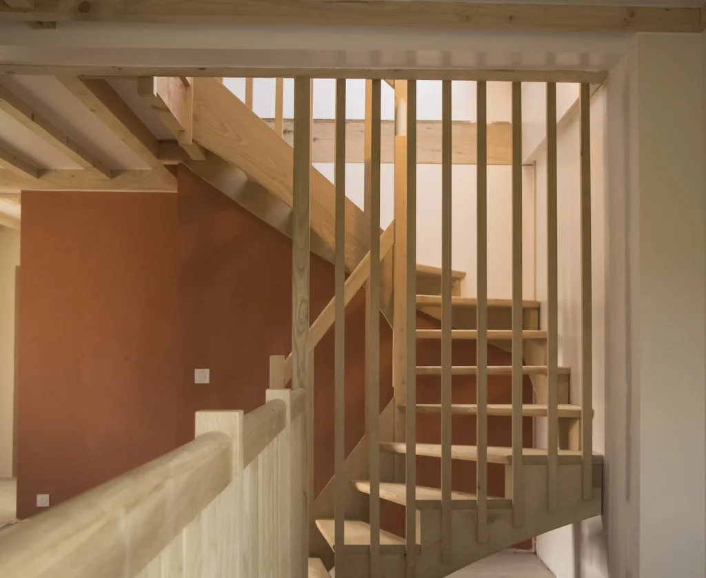 Escalier en châtaignier 2/4 tournant sans contre-marches. La première volée est suspendue à la trémie de l’étage supérieur par les longues balustres qui forment le garde-corps.