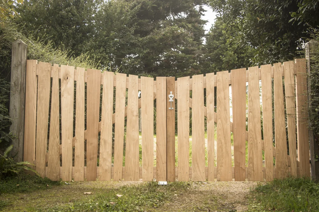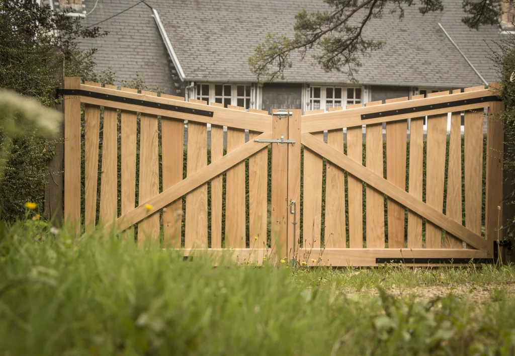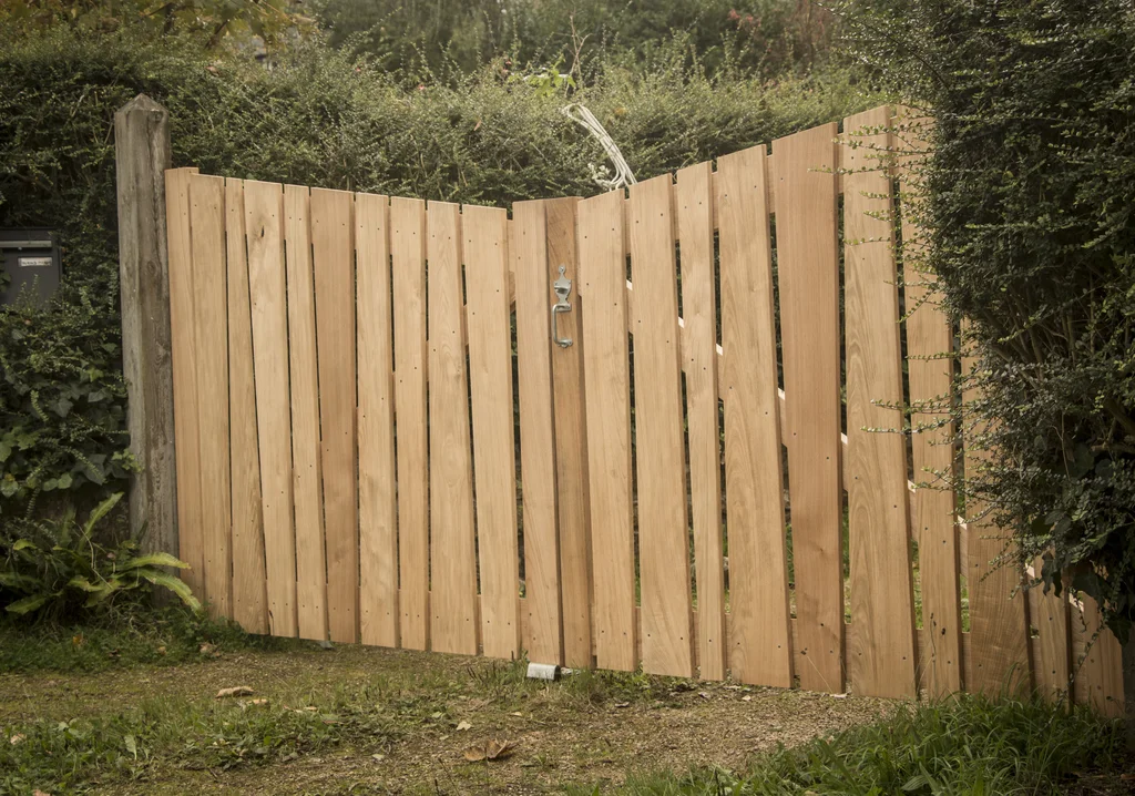 Portail en châtaignier. Cadre avec assemblages tenons-mortaises chevillés. Lames en « queue de billard » vissées avec vis inox.