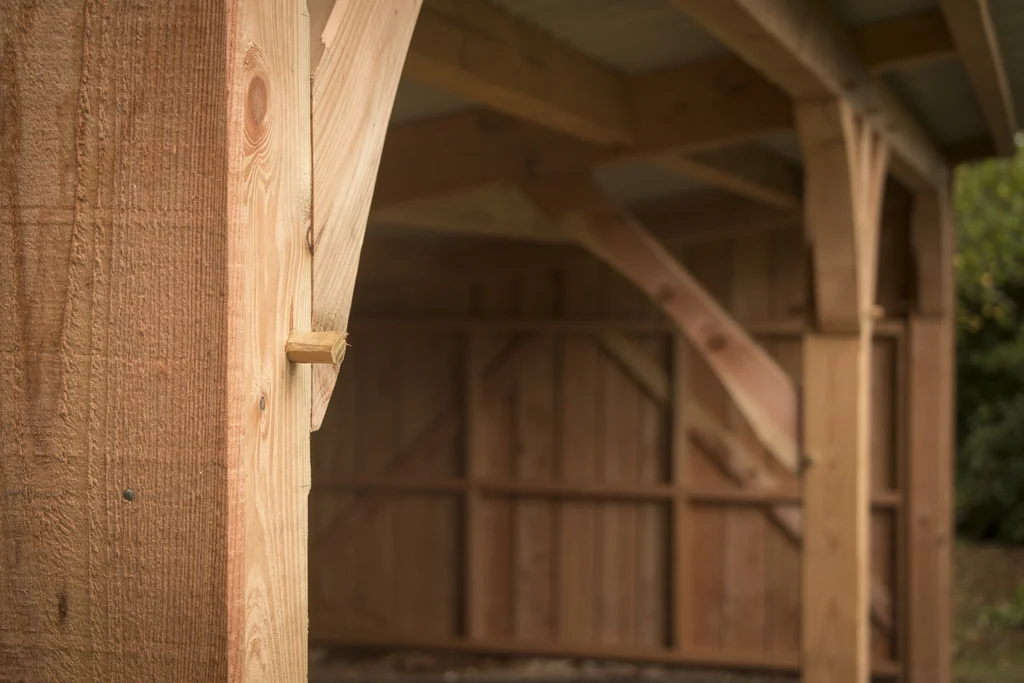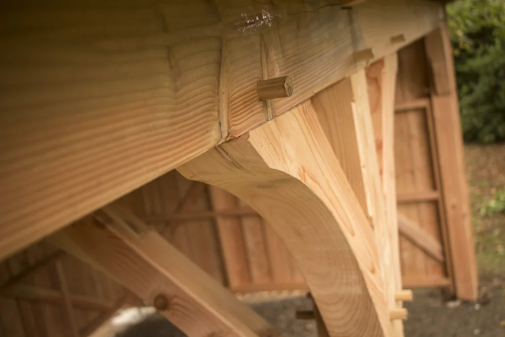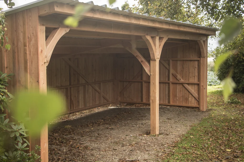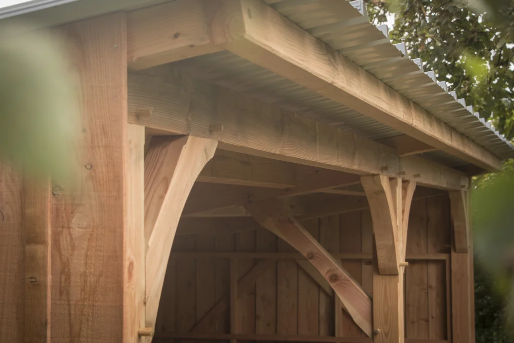 Abri de jardin en douglas. Assemblages traditionnels chevillés, bardage douglas brut de sciage avec couvre-joints. Couverture en bac acier.