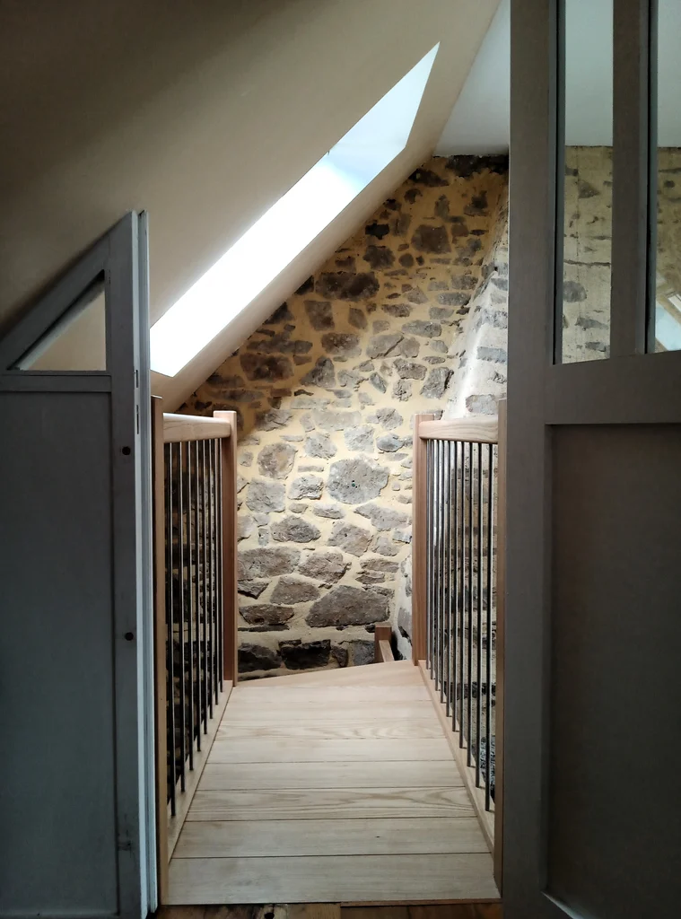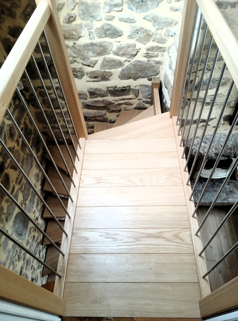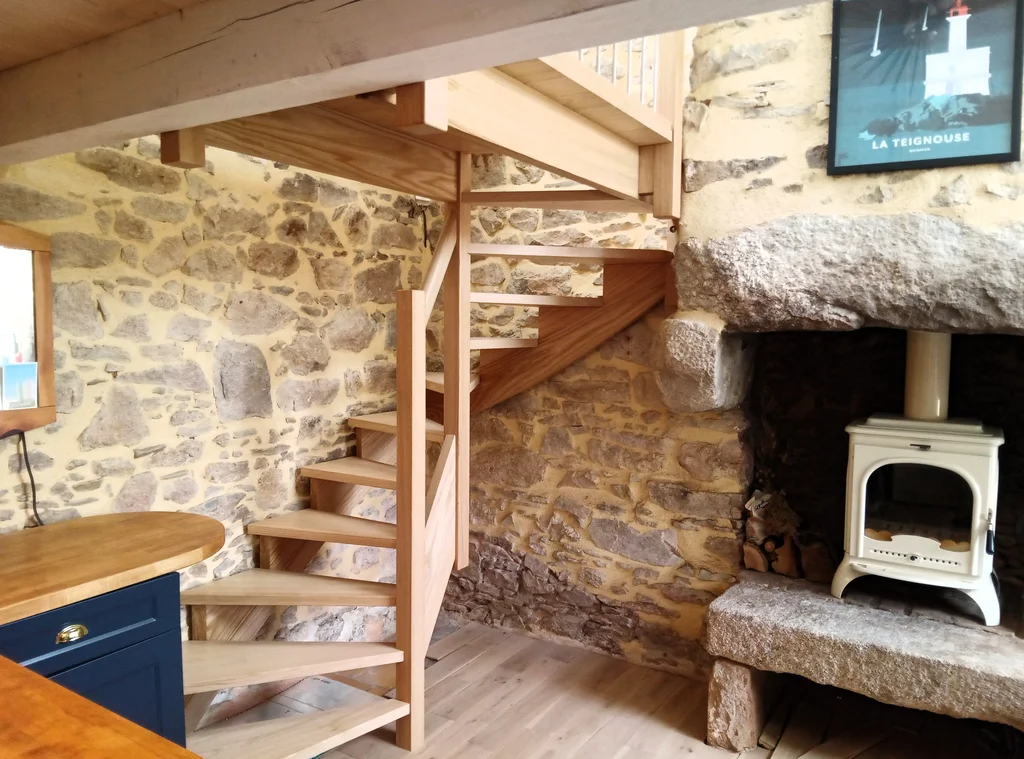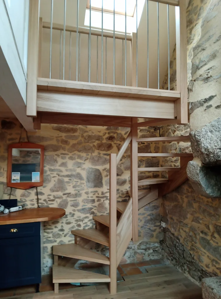 Escalier en châtaignier 3/4 tournant sans contremarches + passerelle suspendue. Garde-corps bois et Inox.