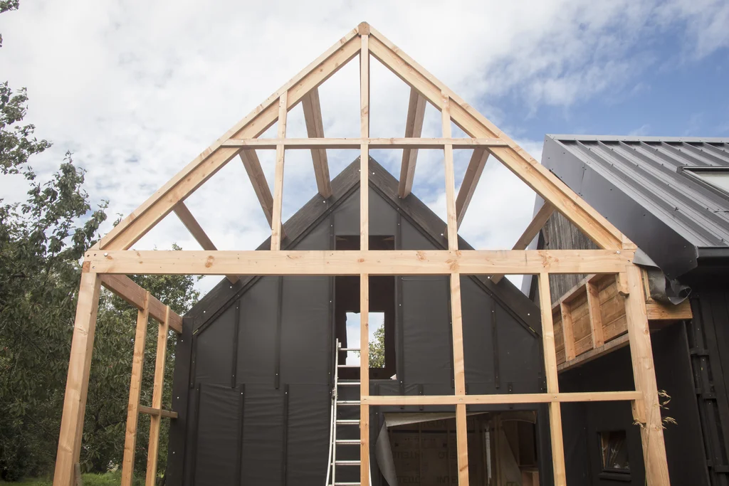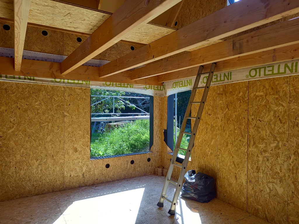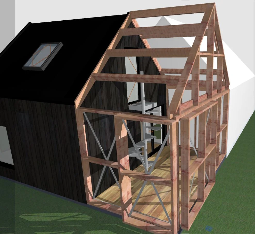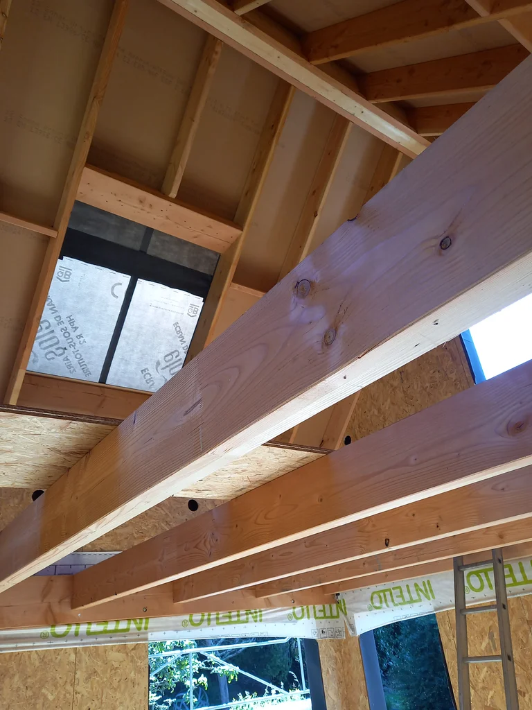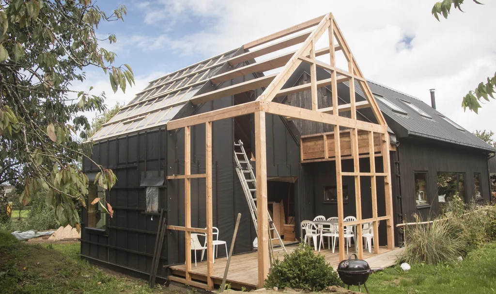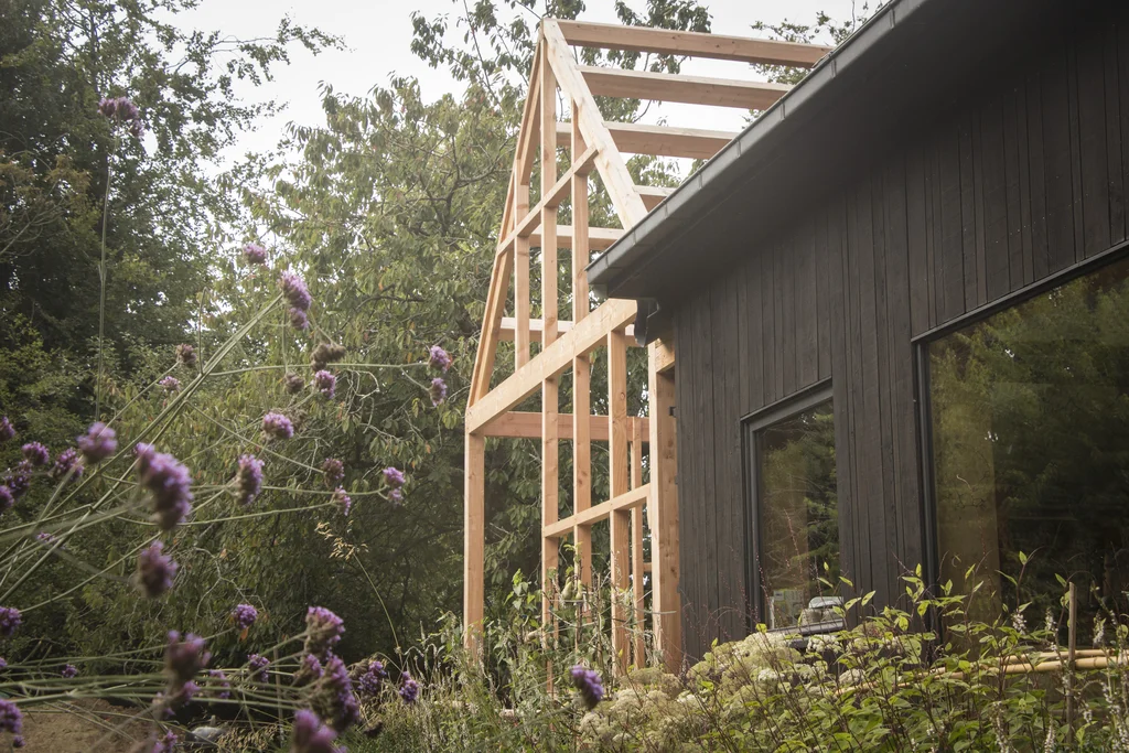 Extension en ossature bois avec structure de jardin d’hiver. Conception, dépôt du permis de construire et fabrication. Ossature et charpente douglas.