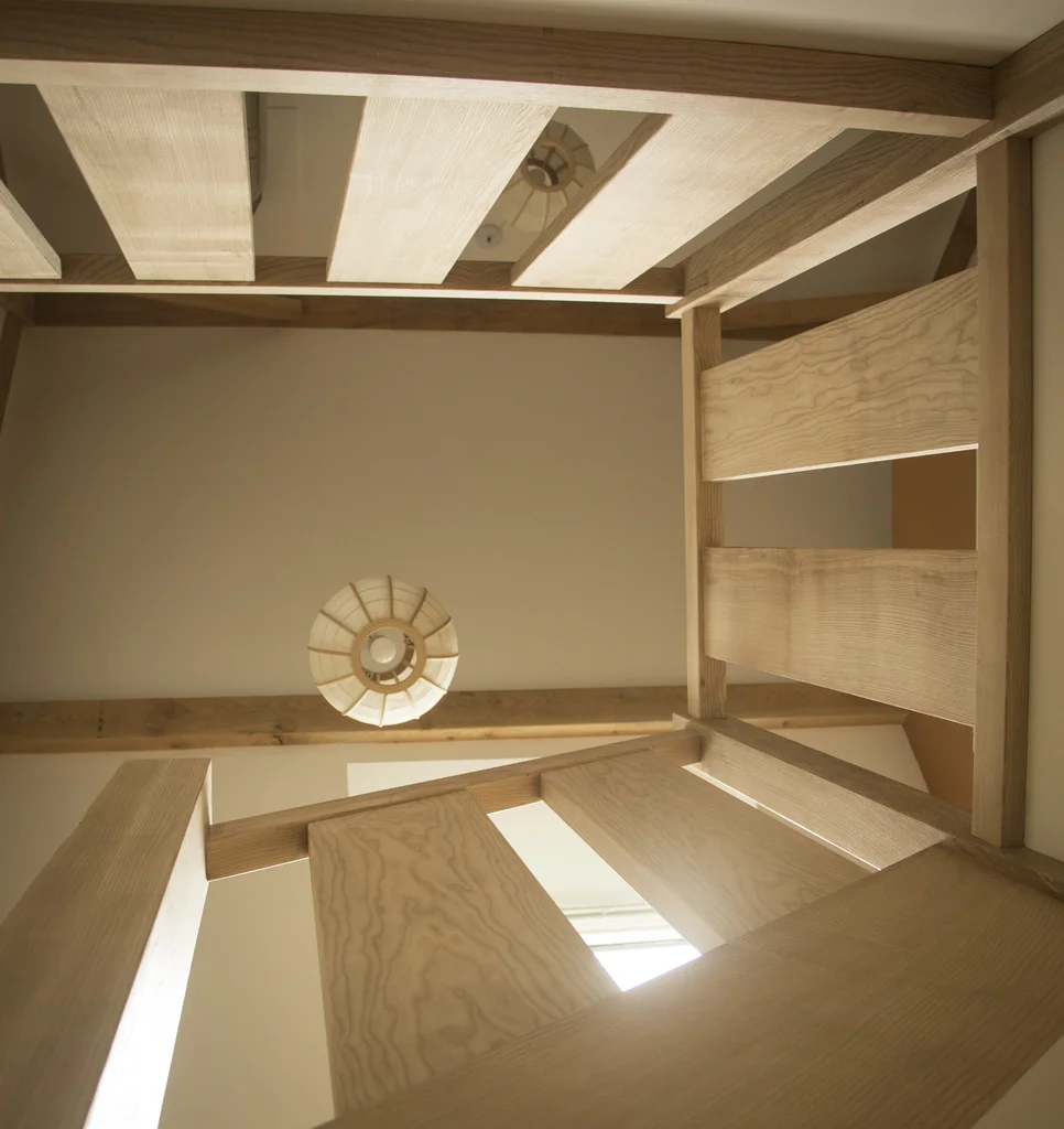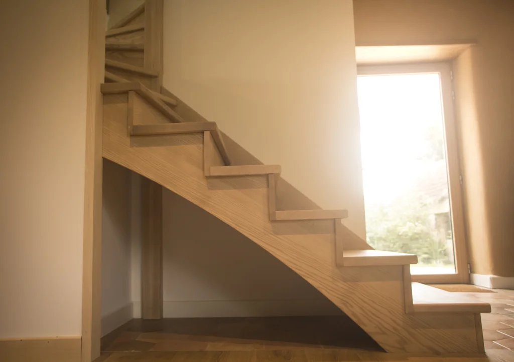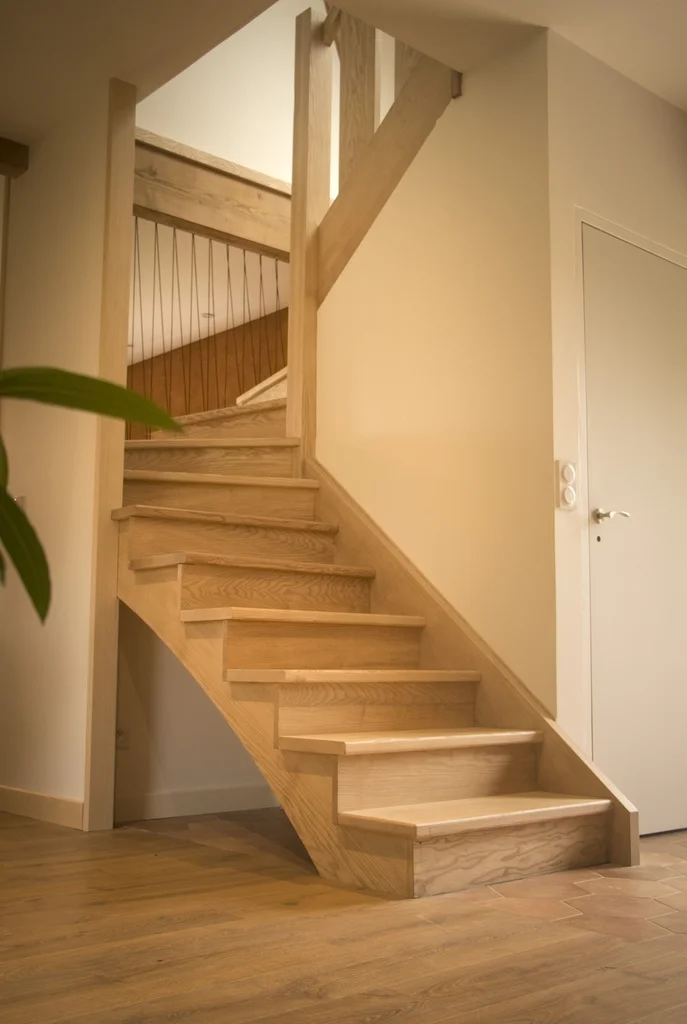 Escalier 2/4 tournant en frêne. Crémaillère cintrée, balustres larges en frêne.