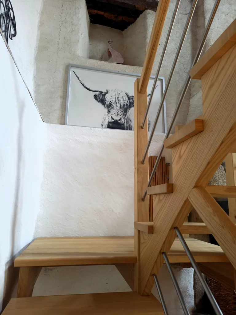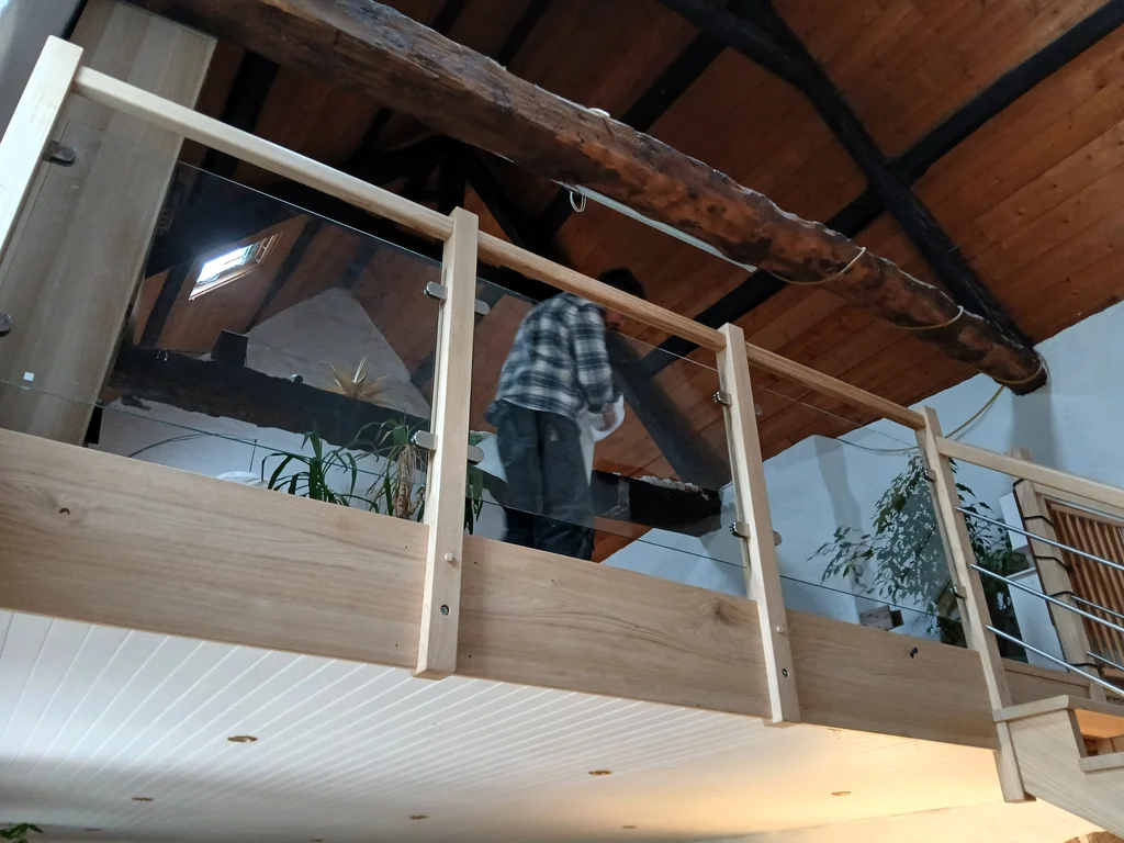 Escalier en châtaignier avec palier de repos. Crémaillères cintrées et garde-corps en verre.